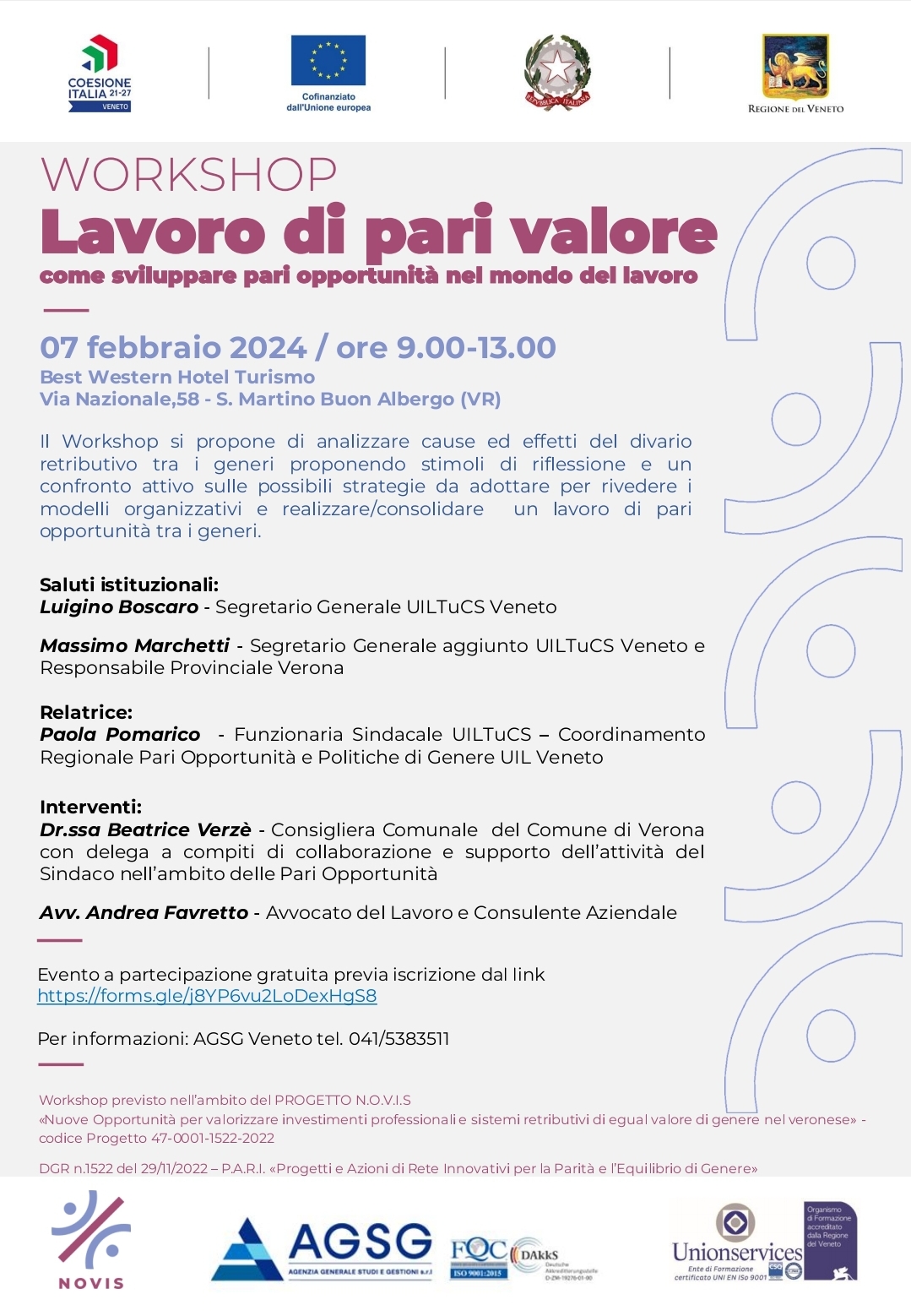 Tutto pronto per il workshop “Lavoro di pari valore”, evento organizzato il 7 febbraio da Agsg.